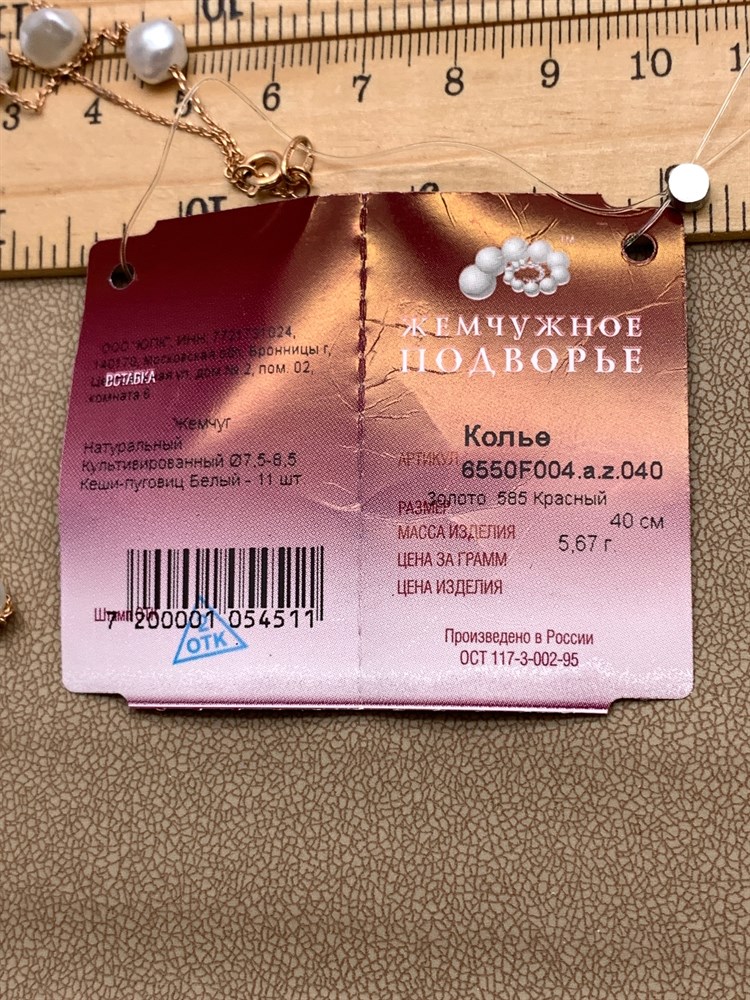 *Ожерелье р.40 Белый Жемчуг д.7,5-8,5 цв Красное арт. 6.F004.a.z-511 Вес 5,67 г