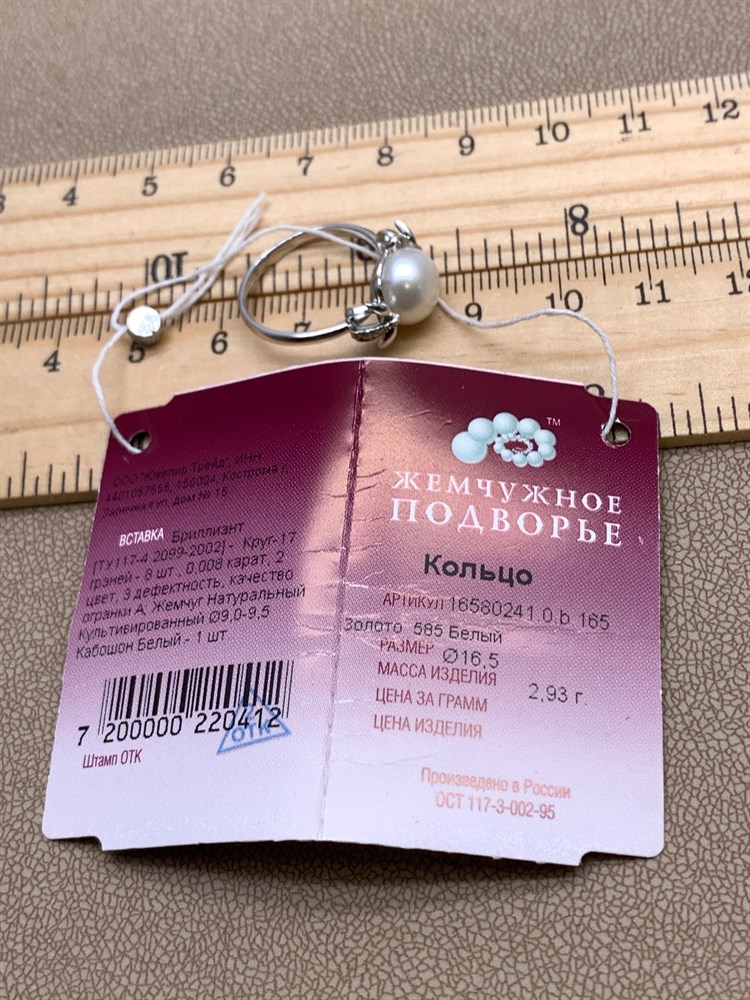 *Кольцо р.16,5 Белый Жемчуг д.9-9,5 цв Белое арт. 1.0241.0.b-412 Вес 2,93 г