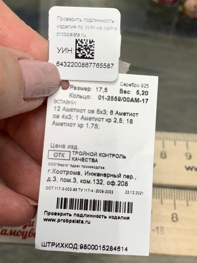 *Кольцо р.21 Аметист арт. 01-2559/00АМ-17-091 вес 5,65 г