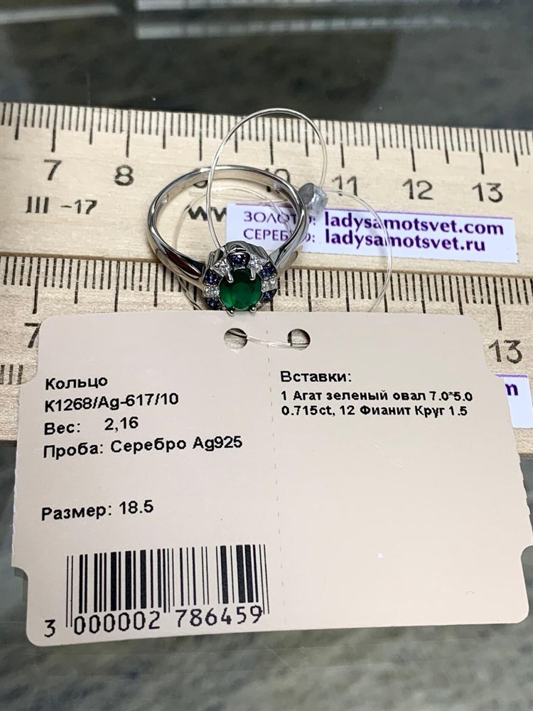 *Кольцо р.18,5 Зеленый Агат арт. К1268/Ag-617/10-459 (вес около 2,1-2,3 г)