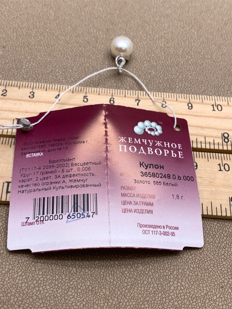*Кулон Белый Жемчуг д.8,5-9 цв Белое арт. 3.0248.0.b-547 Вес 1,8 г