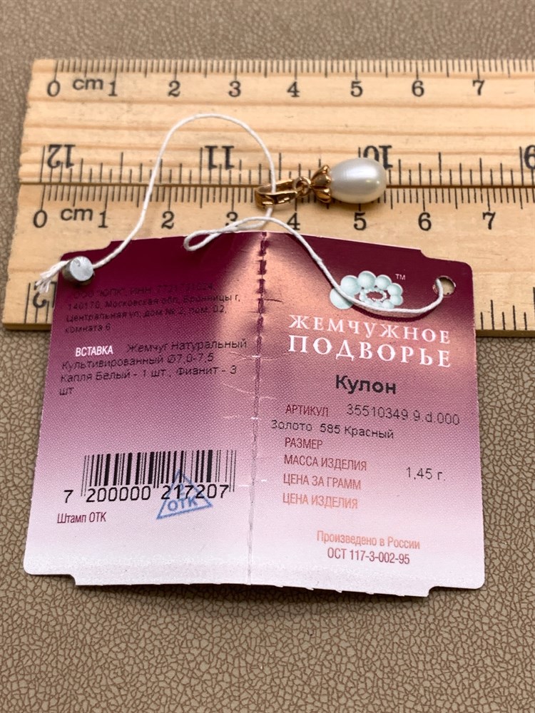 *Кулон Белый Жемчуг д.7-7,5 цв Красное арт. 3.0349.9.d-207 Вес 1,45 г