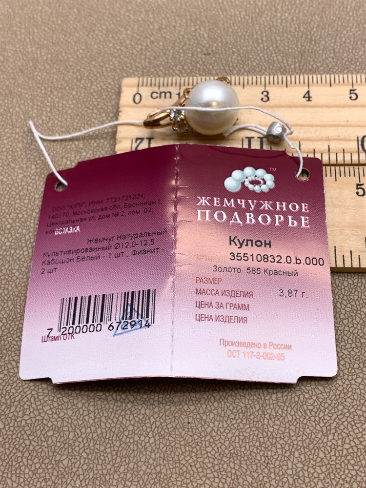 *Кулон Белый Жемчуг д.12-12,5 цв Красное арт. 3.0832.0.b-914 Вес 3,87 г