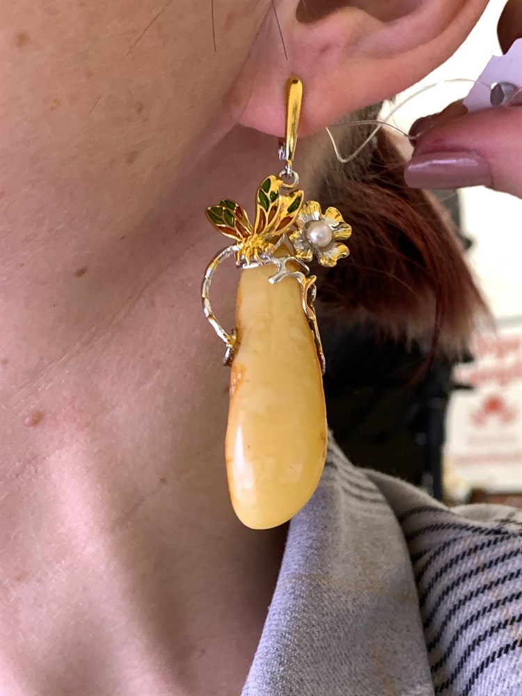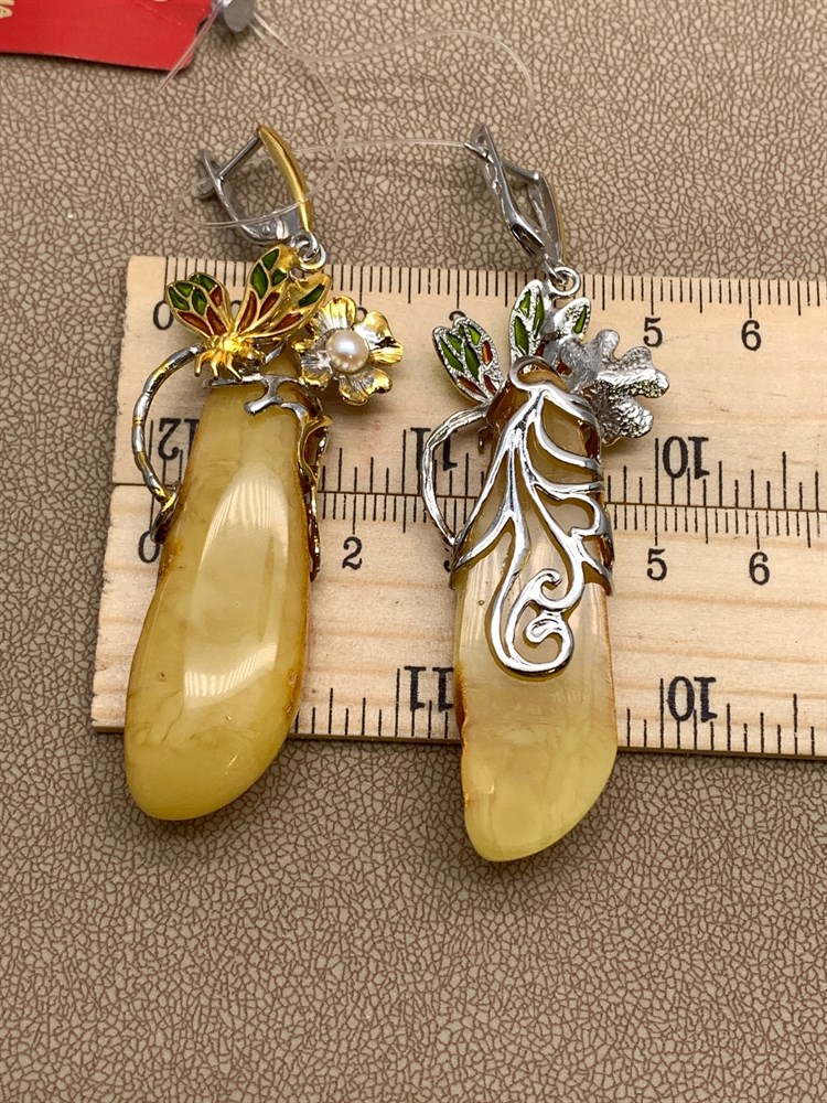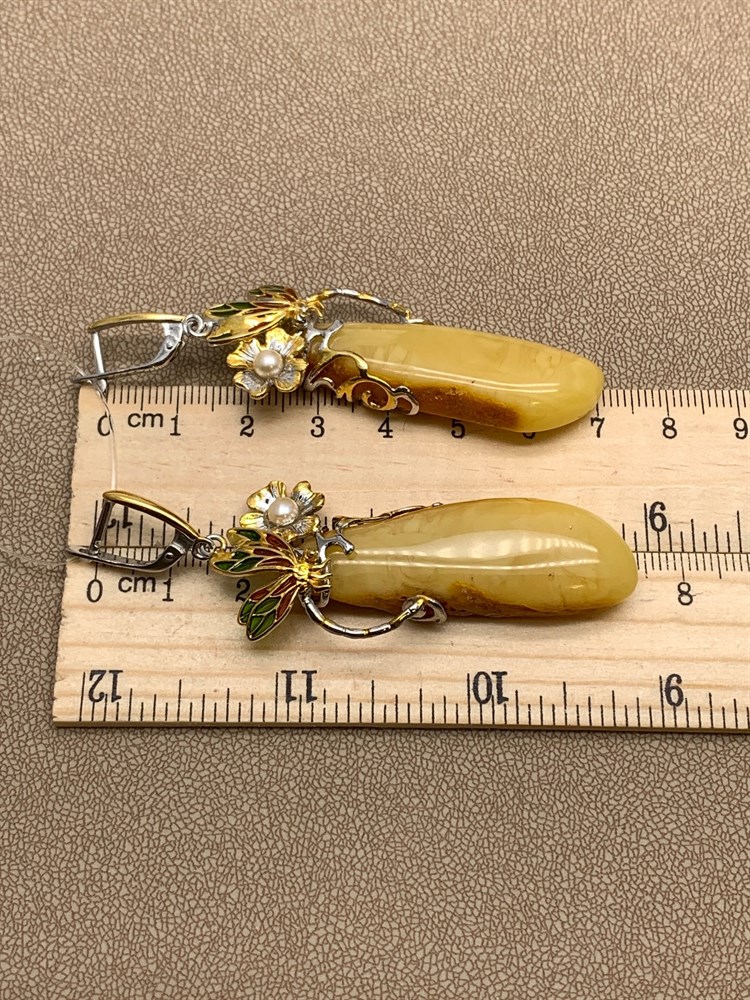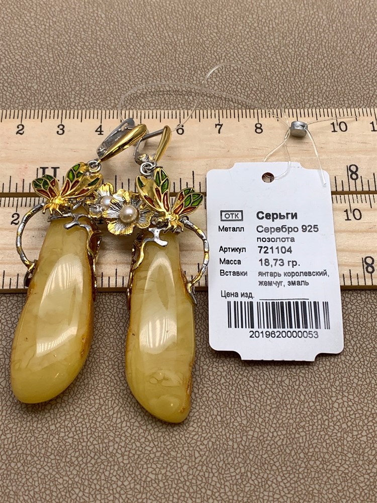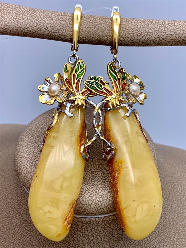 *Серьги Королевский Янтарь Жемчуг Эмаль Эксклюзив арт. 721104п-053 Вес 18,73 г