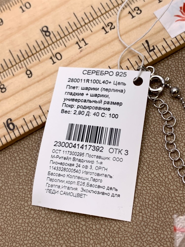 *Цепь р.40 Перлина шарики гладкие арт. 280011R100L40+392 (Вес 2,9 г)